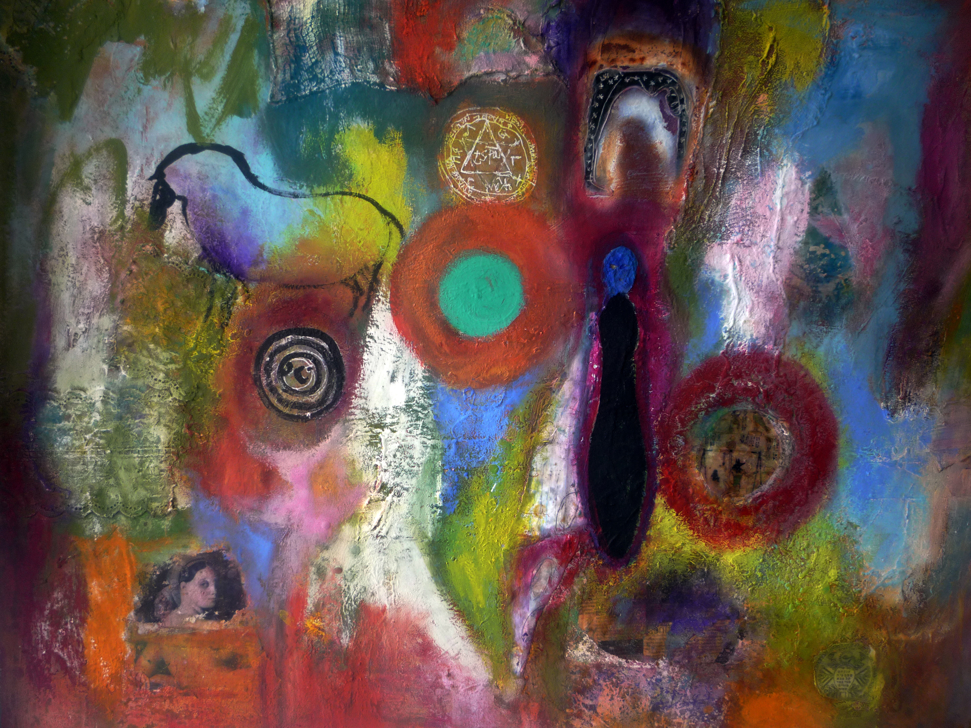 Making use of her unending imagination, she includes every bit of her surroundings, reaching the dimension of dream worlds, opening to a spontaneous and candid spirituality. In her paintings we find all the strength of the colors from South America, which together with the graphic power, brings life to original pictorial settings where imaginary characters, traces, animals and symbols freely intermingle.