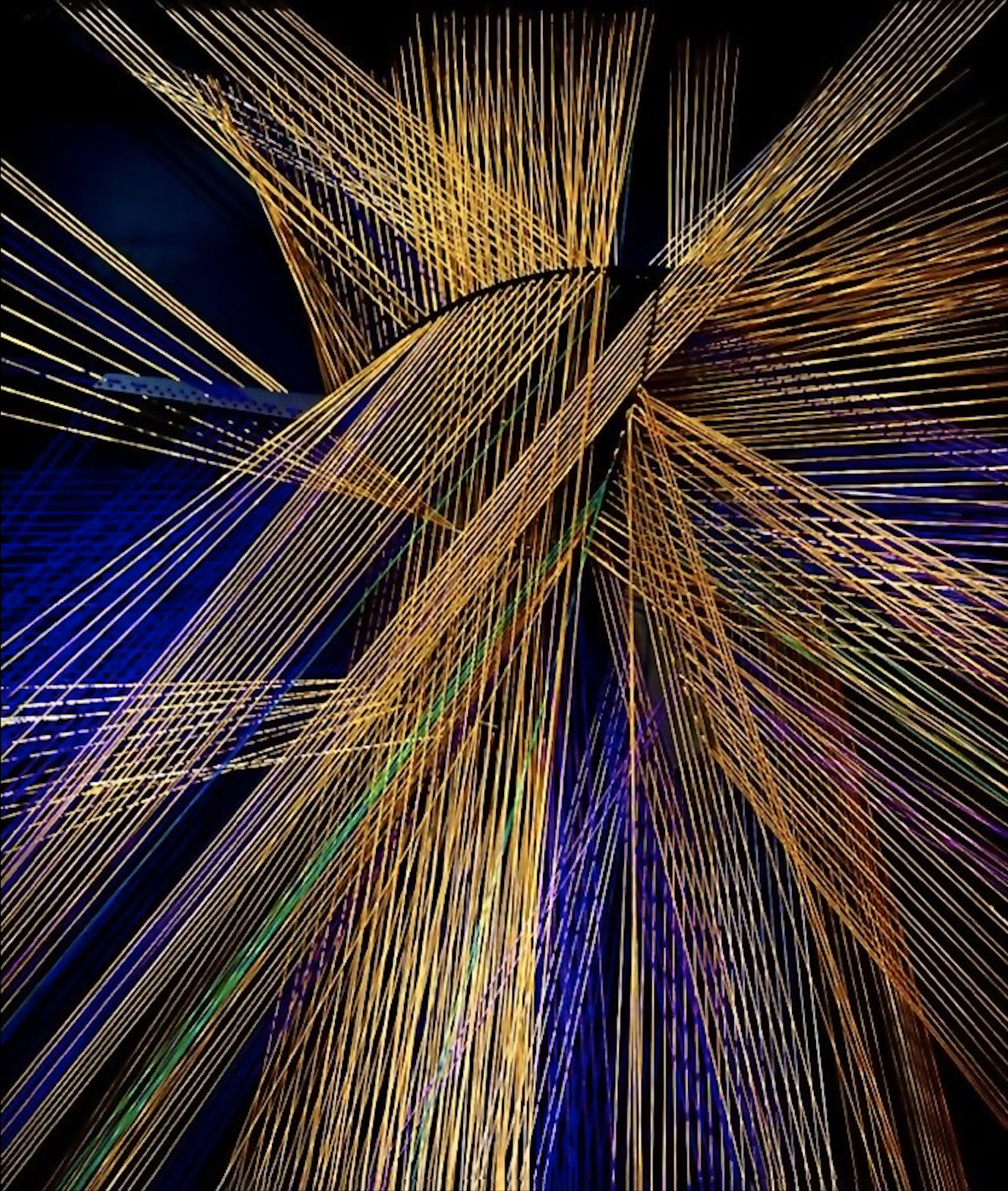 … works with images drawn in space. Her work resembles the shape of clouds or the course of a river; the contour of a hill or the curves of the wind. “What is seen is a game – a test – that does not escape the curiosity that leads the artist to generate links and points of union between the two-dimensional and the three-dimensional, based on color, shapes and the intersection of lines.”